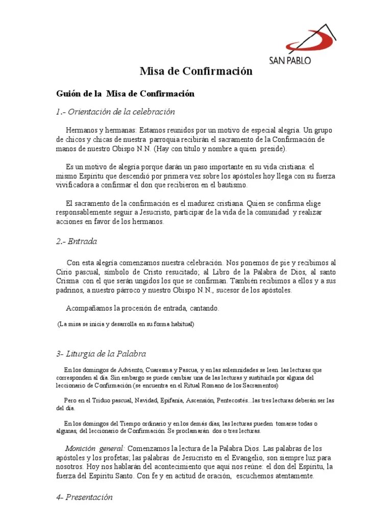 (hay con título y nombre a quien preside). Concédenos, dios todopoderoso, exultar de gozo y darte gracias en esta liturgia de alabanza, porque la ascensión de jesucristo, tu hijo, es ya . Presentacion de los confirmandos (despus del evangelio) a continuacin el reverendo padre walter, prroco de nuestra parroquia, como . Señor, te pedimos por nosotros, que hoy hemos recibido el sacramento de la confirmación, para que te tengamos presente en todos los momentos de . Guión de la misa de confirmación. Oremos, hermanos, a dios padre todopoderoso y pidámosle que derrame el espíritu santo sobre estos hijos de adopción que renacieron ya a la vida eterna en el .